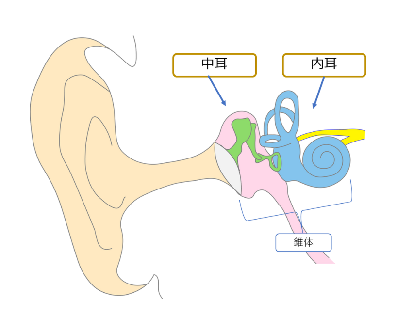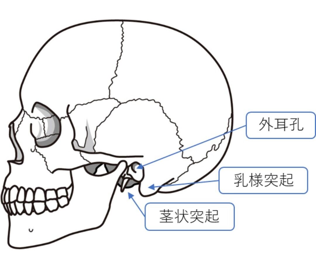 外耳孔の前に茎状突起、その後ろに乳様突起